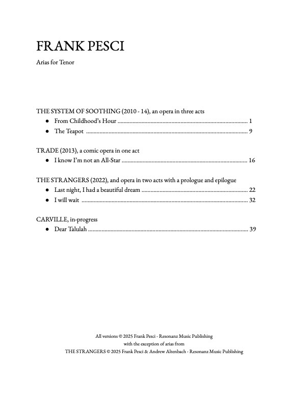 Arias for Tenor from the operas THE SYSTEM OF SOOTHING, TRADE, THE STRANGERS, and CARVILLE. Piano/vocal score.