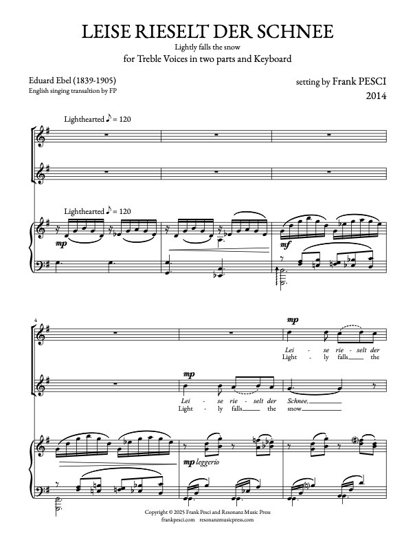 Leise rieselt der Schnee is among the most famous of German Christmas carols. Written by Eduard Ebel (1839-1905), it depicts swirling snowfall as a backdrop to the joyful anticipation of the Holy Night. This setting for treble voices in two parts and keyboard accompaniment features German text with an English singing translation.