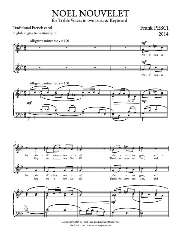 Noël Nouvelet is a traditional French carol describing the manger scene and the appearance of the Magi. This setting for treble voices in two parts with keyboard accompaniment features French text with and English singing translation.